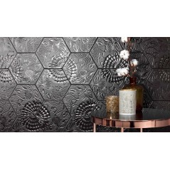 Carrelage décor hexagonal fond noir satiné décor brillant 25x22cm Dif gaudi noirCarrelage décor hexagonal fond noir satiné décor brillant 25x22cm Dif gaudi noir