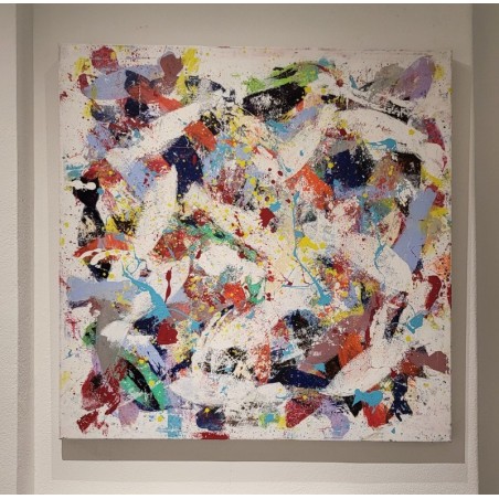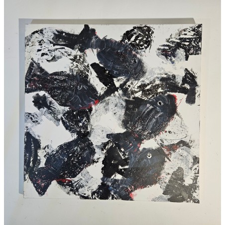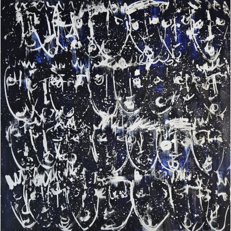 Portrait contemporain abstrait, homme qui pleure sur fond noir acrylique sur toile 116x89cm, tableau peint par Guillaume Marchat. Les lignes expriment cette sensation de pleurs.