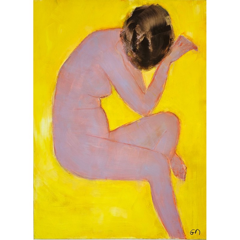 Tableau contemporain figuratif peint par Guillaume Marchat, représentant une femme nue assise qui cache son visage. L'association de la couleur jaune et rose relève un sentiment de provocation, ainsi que sa forte personnalité